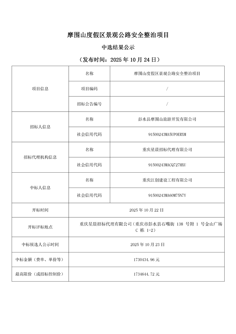 摩圍山度假區(qū)景觀公路安全整治項目中選結(jié)果公示